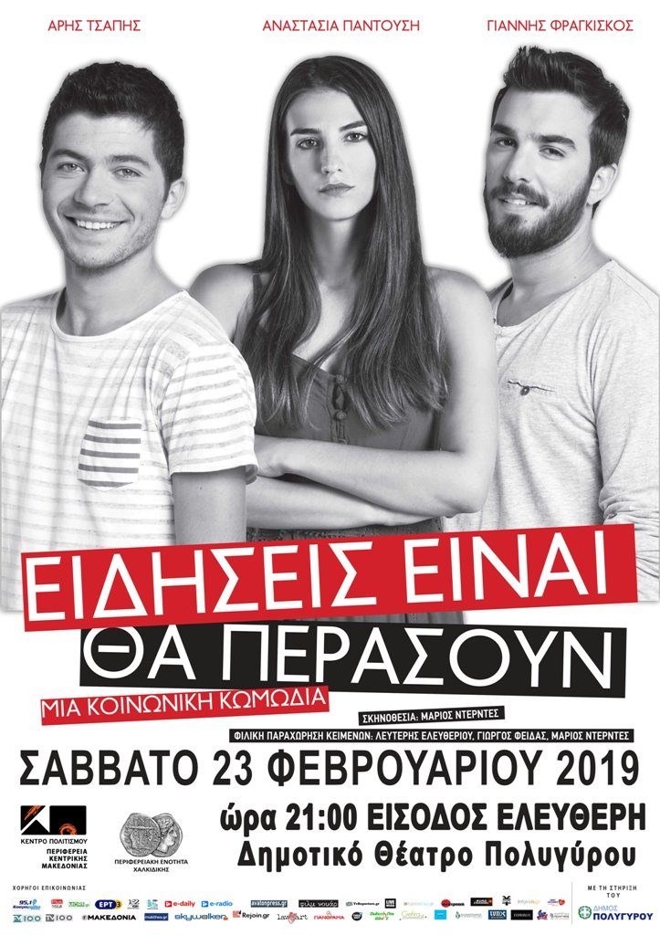 Το Κέντρο Πολιτισμού της Περιφέρειας Κεντρικής Μακεδονίας και η Περιφερειακή Ενότητα Χαλκιδικής παρουσιάζουν την θεατρική παράσταση «Ειδήσεις είναι… θα περάσουν», κοινωνική κωμωδία, σκηνοθεσία Μάριος Ντερντές. Φιλική Παραχώρηση Κειμένων: Λευτέρης Ελευθερίου, Γιώργος Φειδάς, Μάριος Ντερντές