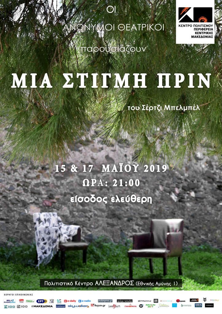 Το Κέντρο Πολιτισμού της Περιφέρειας Κεντρικής Μακεδονίας διοργανώνει την θεατρική παράσταση «ΜΙΑ ΣΤΙΓΜΗ ΠΡΙΝ» του Σέρτζι Μπελμπέλ, από την θεατρική ομάδα «Ανώνυμοι Θεατρικοί», σε σκηνοθεσία: Χριστίνα Καρασίμου, Γιώργου Κωστίδη, Μαριάννας Πασχάλη, Ειρήνης Αγκιστριώτη.