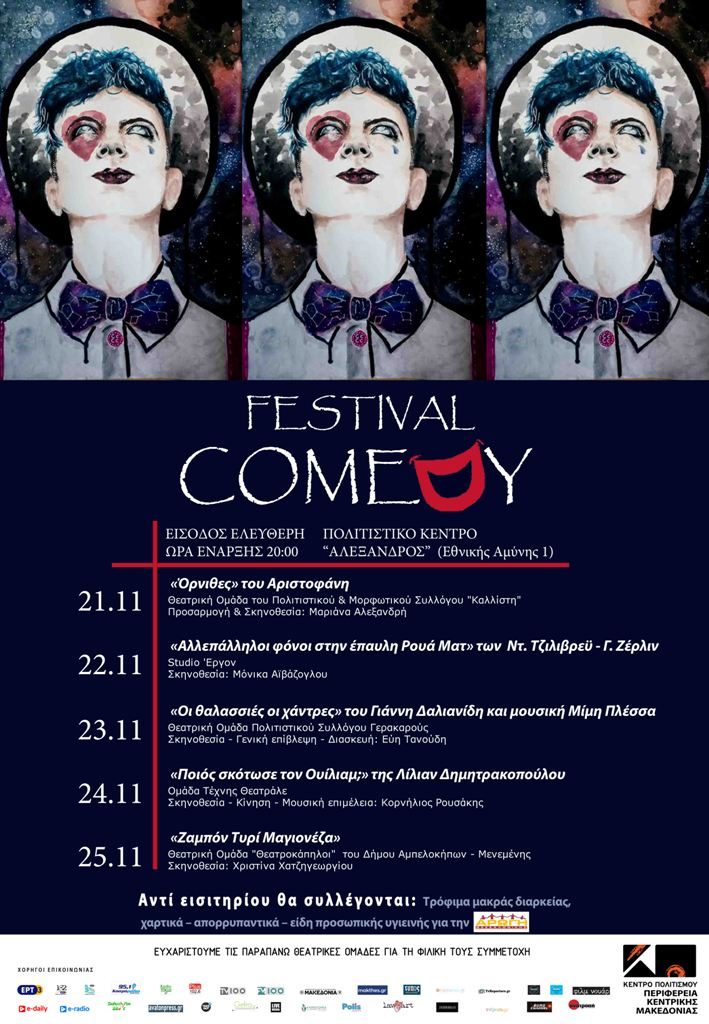 Στο «Comedy Festival» φιλοξενούμε και φέτος 5 κωμωδίες από τις καλύτερες θεατρικές ομάδες της Περιφέρειας Κεντρικής Μακεδονίας.