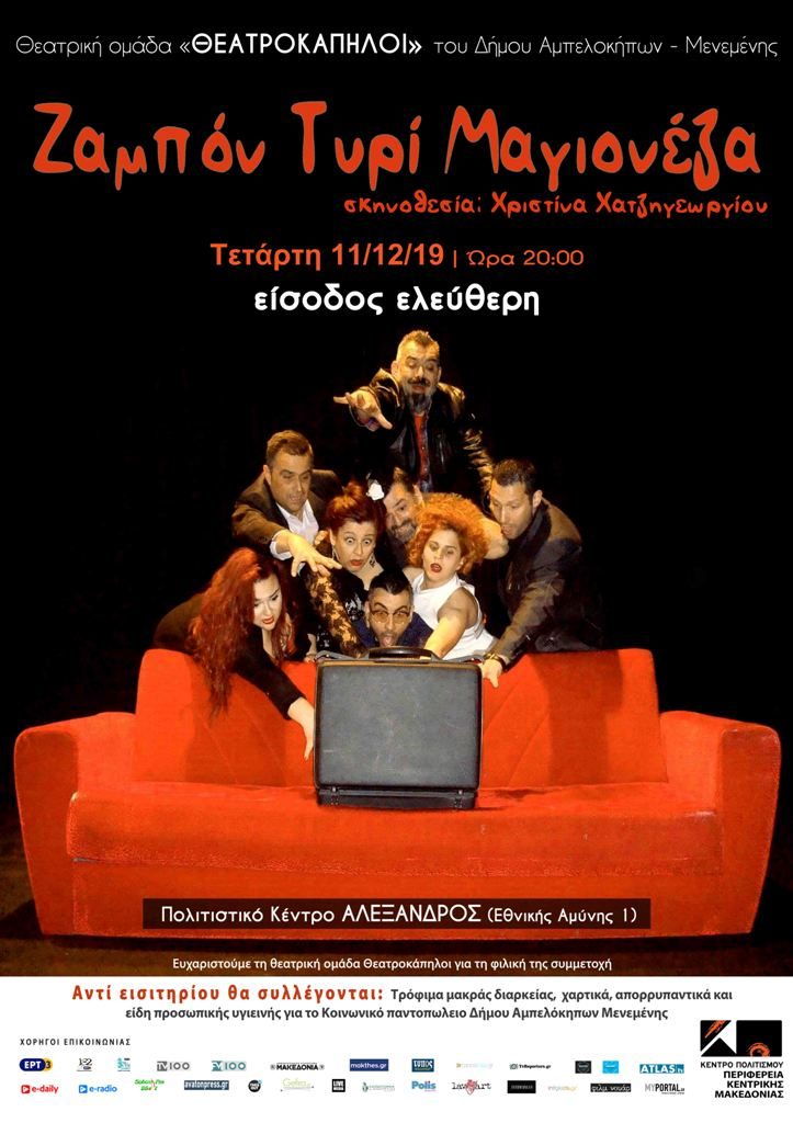 Το Κέντρο Πολιτισμού της Περιφέρειας Κεντρικής Μακεδονίας διοργανώνει τη θεατρική παράσταση «Ζαμπόν Τυρί Μαγιονέζα» από τη θεατρική ομάδα «ΘΕΑΤΡΟΚΑΠΗΛΟΙ» του Δήμου Αμπελοκήπων-Μενεμένης, σε σκηνοθεσία της Χριστίνας Χατζηγεωργίου.