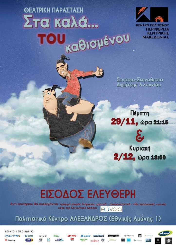 Το Κέντρο Πολιτισμού της Περιφέρειας Κεντρικής Μακεδονίας διοργανώνει την θεατρική παράσταση «Στα Καλά του Καθισμένου» σε σενάριο και σκηνοθεσία Δημήτρη Αντωνίου με πρωταγωνιστές τον Δημήτρη Αντωνίου και τον Μιχάλη Σαρόπουλο.