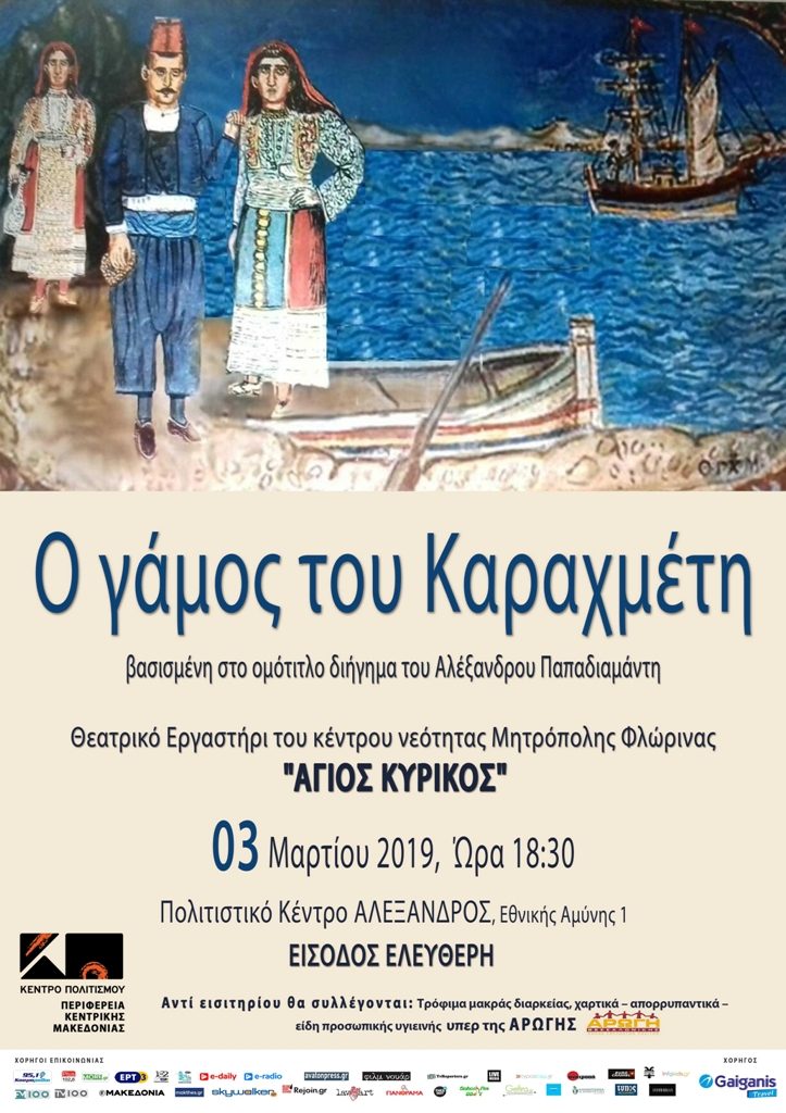 Το Κέντρο Πολιτισμού της Περιφέρειας Κεντρικής Μακεδονίας διοργανώνει και παρουσιάζει την θεατρική Παράσταση «Ο Γάμος του Καραχμέτη» βασισμένη στο ομότιτλο διήγημα του Αλέξανδρου Παπαδιαμάντη, από το Θεατρικό Εργαστήρι του Κέντρου Νεότητας Μητρόπολης Φλώρινας «Άγιος Κύρικος»