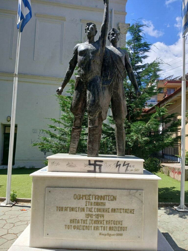 Η Τ.Ε. Πέλλας του ΚΚΕ καταγγέλλει τη βεβήλωση του μνημείου της Εθνικής Αντίστασης στο κέντρο του πεζόδρομου των Γιαννιτσών από θρασύδειλους ναζί-φασίστες που βγήκαν από τα λαγούμια τους μέσα στη νύχτα.