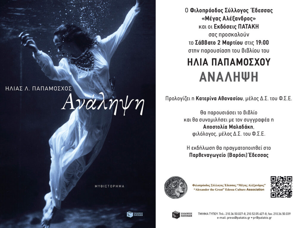 Ο Φιλοπρόοδος Σύλλογος Έδεσσας «Μέγας Αλέξανδρος» διοργανώνει εκδήλωση παρουσίασης του μυθιστορήματος του Ηλία Παπαμόσχου «Ανάληψη» (εκδόσεις Πατάκης).