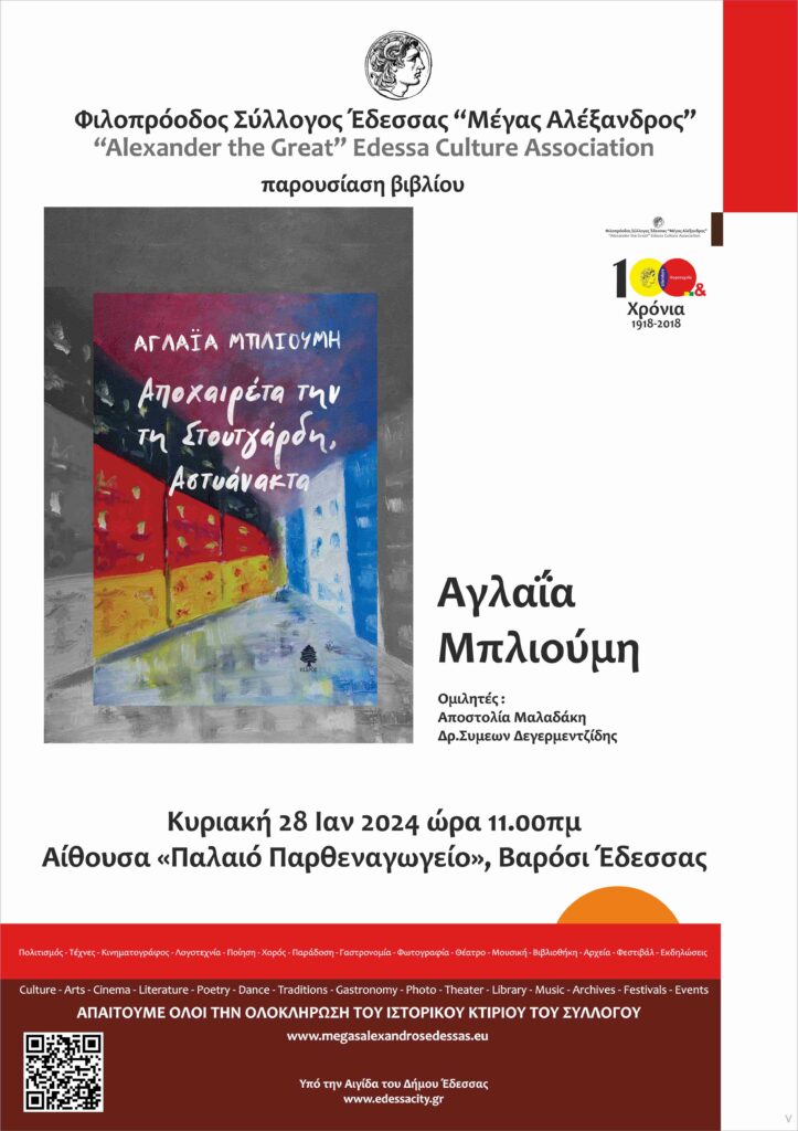 Ο Φιλοπρόοδος Σύλλογος Έδεσσας «Μέγας Αλέξανδρος» διοργανώνει εκδήλωση παρουσίασης του βιβλίου της Αγλαΐας Μπλιούμη «Αποχαιρέτα την τη Στουτγάρδη, Αστυάνακτα» (εκδόσεις Κέδρος).