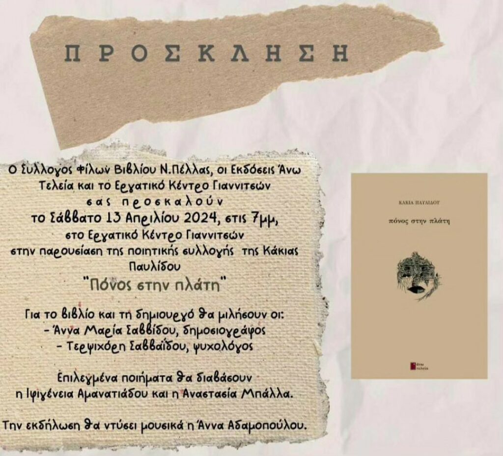 Ο Σύλλογος Φίλων Βιβλίου Ν. Πέλλας, ο Πολιτιστικός Σύλλογος Εργατικού Κέντρου Π.Ε. Πέλλας και οι εκδόσεις «Άνω Τελεία» σας προσκαλούν στην παρουσίαση της ποιητικής συλλογής «Πόνος στην Πλάτη» της Κάκιας Παυλίδου το Σάββατο 13 Απριλίου, ώρα 7 μμ, στην αίθουσα του Εργατικού Κέντρου (Λιάπτση 7).