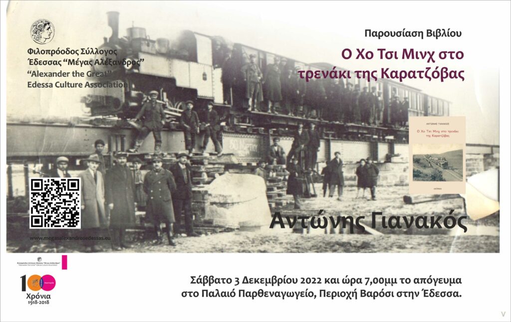 Το βιβλίο «Ο Χο Τσι Μινχ στο τρενάκι της Καρατζόβας» (εκδ.Ενύπνιο, 2022) του Αντώνη Γιανακού, θα παρουσιάσει ο Φιλοπρόοδος Σύλλογος Έδεσσας «Μέγας Αλέξανδρος», το Σάββατο 3 Δεκεμβρίου 2022 και ώρα 7 το απόγευμα, στο Παρθεναγωγείο (Βαρόσι, Έδεσσα).