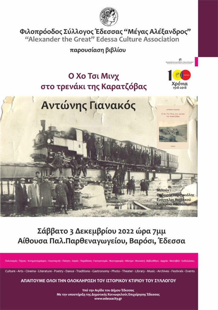 Το βιβλίο «Ο Χο Τσι Μινχ στο τρενάκι της Καρατζόβας» (εκδ.Ενύπνιο, 2022) του Αντώνη Γιανακού, θα παρουσιάσει ο Φιλοπρόοδος Σύλλογος Έδεσσας «Μέγας Αλέξανδρος», το Σάββατο 3 Δεκεμβρίου 2022 και ώρα 7 το απόγευμα, στο Παρθεναγωγείο (Βαρόσι, Έδεσσα).