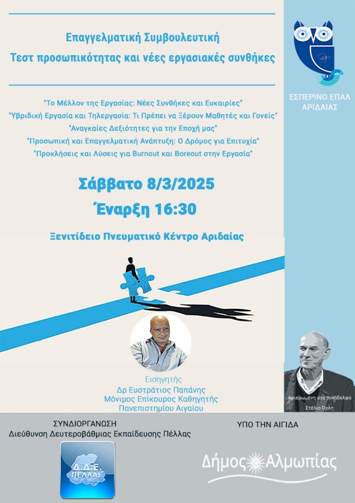 Με μεγάλη μας χαρά σας προσκαλούμε στην Ημερίδα Επαγγελματικού Προσανατολισμού που διοργανώνεται σε συνδιοργάνωση με τη ΔΔΕ Πέλλας. Η εκδήλωση στοχεύει να προσφέρει ένα δημιουργικό φόρουμ για την ανταλλαγή απόψεων σχετικά με τις εξελίξεις στην αγορά εργασίας και τον επαγγελματικό προσανατολισμό των νέων μας.