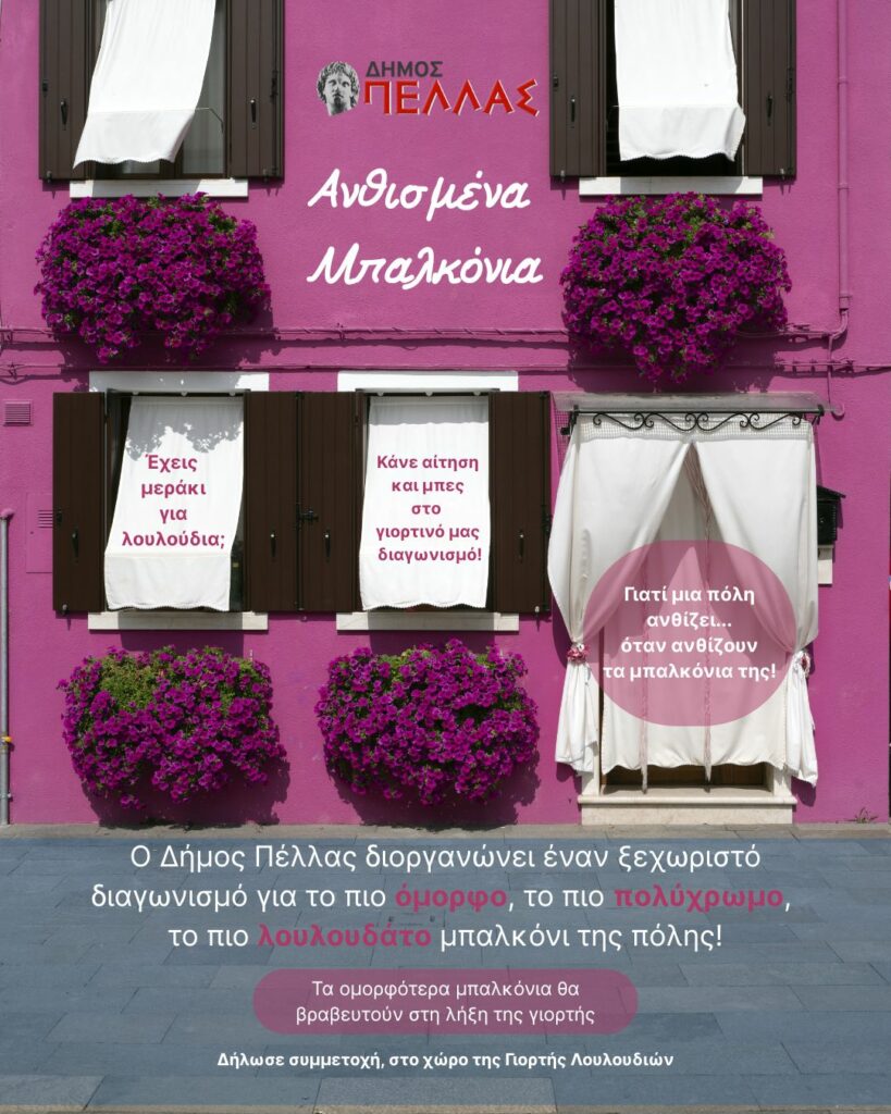 Στο πλαίσιο της «2ης Γιορτής των Λουλουδιών», ο Δήμος Πέλλας διοργανώνει έναν ξεχωριστό διαγωνισμό για το πιο όμορφο, το πιο πολύχρωμο, το πιο λουλουδάτο μπαλκόνι της πόλης των Γιαννιτσών!