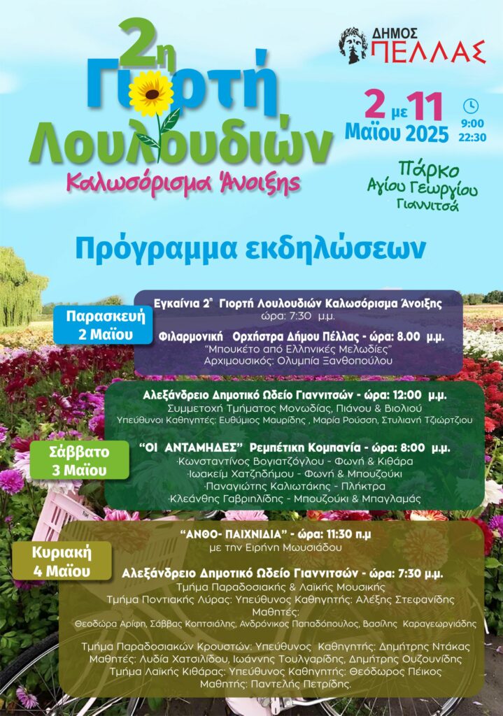 Ραντεβού, λοιπόν, στο πάρκο του Αγίου Γεωργίου, από τις 2 έως τις 11 Μαΐου, για να απολαύσουμε μαζί την πιο πολύχρωμη γιορτή της χρονιάς στο Δήμο Πέλλας!