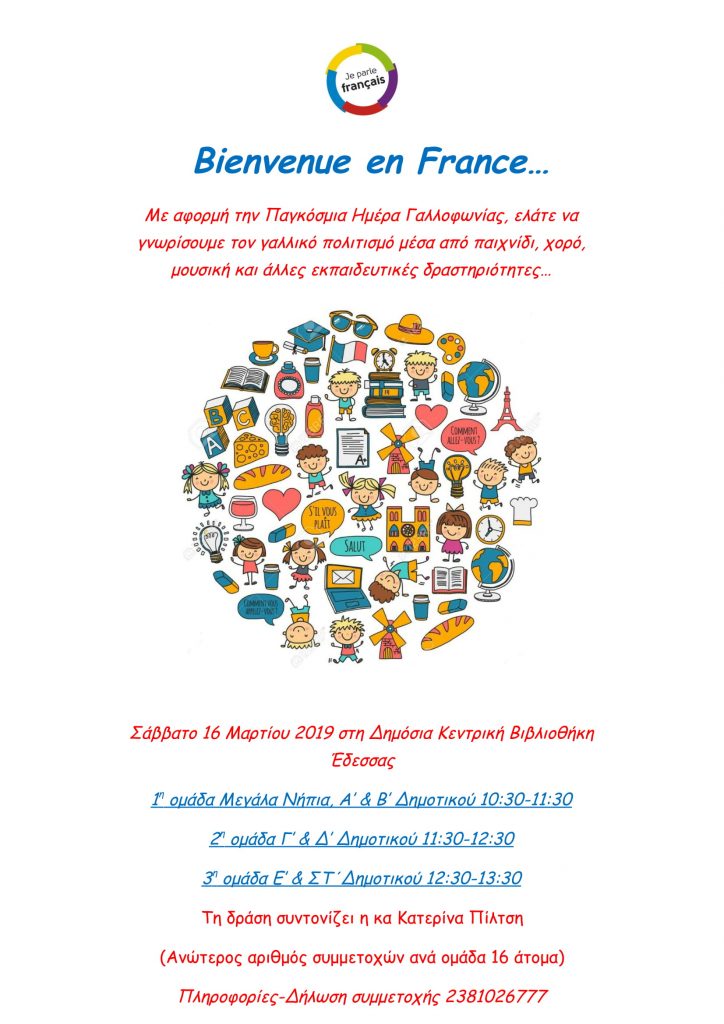 Το Σάββατο 16 Μαρτίου 2019 η Δημόσια Κεντρική Βιβλιοθήκη Έδεσσας με αφορμή την Παγκόσμια Ημέρα Γαλλοφωνίας διοργανώνει εκπαιδευτική δράση για να γνωρίσουμε τον γαλλικό πολιτισμό μέσα από παιχνίδι, χορό, μουσική και άλλες εκπαιδευτικές δραστηριότητες.