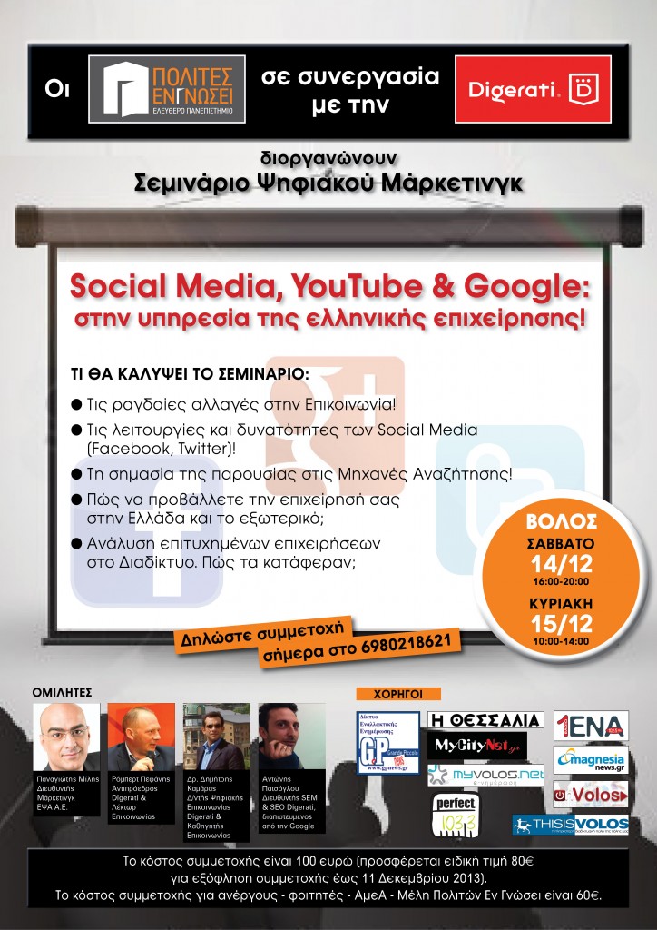 Συνεχίζονται με μεγάλο ενδιαφέρον οι εγγραφές από επιχειρηματίες, Φοιτητές αλλά και ιδιώτες που επιθυμούν να συμμετέχουν στο Σεμινάριο Ψηφιακού Μάρκετινγκ με θέμα «Social Media, YouTube και Google: στην υπηρεσία της Ελληνικής επιχείρησης» που διοργανώνουν οι Πολίτες Εν Γνώσει σε συνεργασία με τη Digerati Α.Ε., το ερχόμενο Σάββατο και Κυριακή 14 & 15 Δεκεμβρίου στο Βόλο.