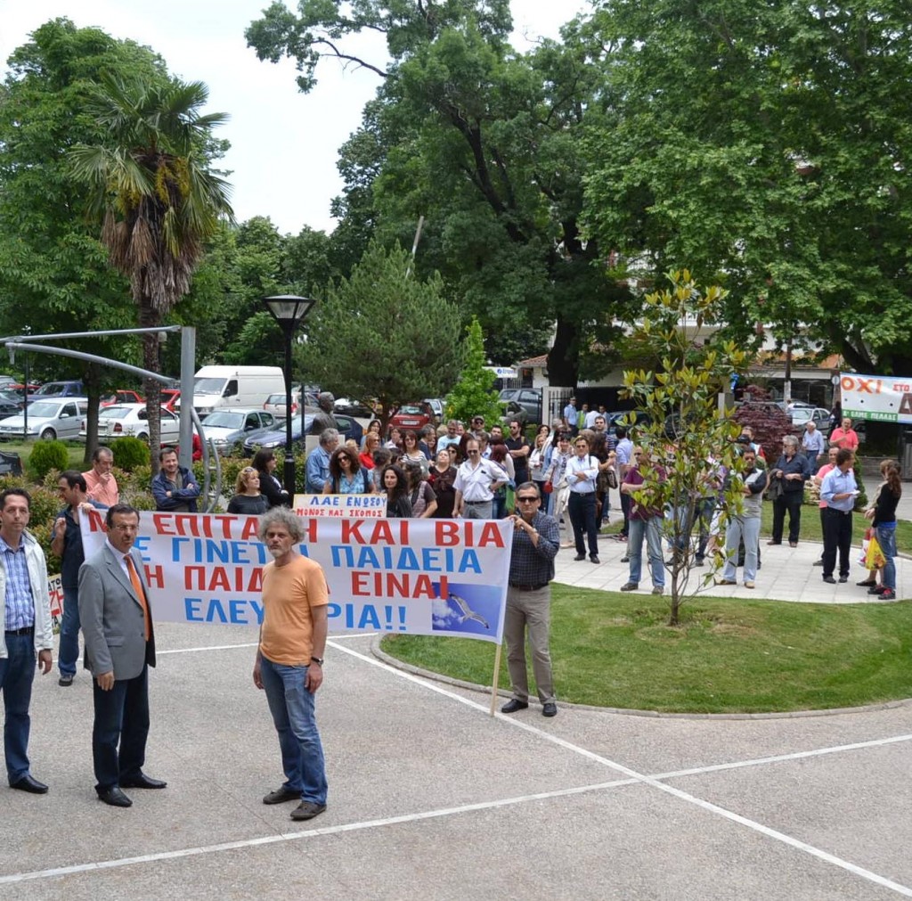 Διαδήλωση των καθηγητών της Α’ ΕΛΜΕ Πέλλας πραγματοποιήθηκε σήμερα (17/5) στο Διοικητήριο Πέλλας, εκφράζοντας την αντίθεσή τους στα μέτρα που προωθεί η κυβέρνηση.