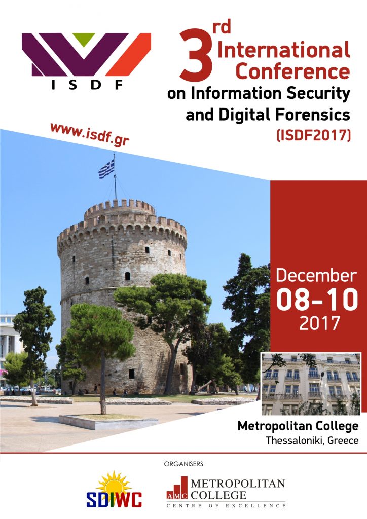 Η Σχολή Πληροφορικής του Μητροπολιτικού Κολλεγίου Θεσσαλονίκης και η SDIWC (Κοινωνία της Ψηφιακής Πληροφορίας και των Ασύρματων Επικοινωνιών) διοργανώνουν για τρίτη συνεχή χρονιά στην Ελλάδα, το «Διεθνές Συνέδριο στην Ασφάλεια Πληροφοριών και την Ηλεκτρονική Εγκληματολογία (International Conference in Information Security and Digital Forensics-ISDF 2017)» στη Θεσσαλονίκη, από τις 8 έως και τις 10 Δεκεμβρίου 2017.