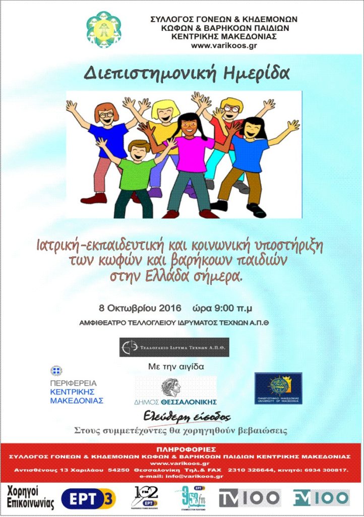 Διεπιστημονική ημερίδα με θέμα την «ιατρική, εκπαιδευτική και κοινωνική υποστήριξη των κωφών και βαρήκοων παιδιών στην Ελλάδα σήμερα» διοργανώνει ο Σύλλογος Γονέων και Κηδεμόνων Κωφών και Βαρήκοων Παιδιών Κεντρικής Μακεδονίας το Σάββατο 8 Οκτωβρίου 2016 στις 09:00 το πρωί στο αμφιθέατρο του Τελλόγλειου Ιδρύματος Τεχνών του Α.Π.Θ., υπό την αιγίδα της Περιφέρειας Κεντρικής Μακεδονίας.