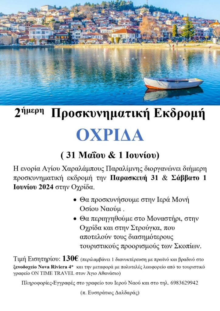 Η ενορία Αγίου Χαραλάμπους Παραλίμνης διοργανώνει διήμερη προσκυνηματική εκδρομή την Παρασκευή 31 Μαΐου και Σάββατο 1 Ιουνίου 2024 στην Οχρίδα.