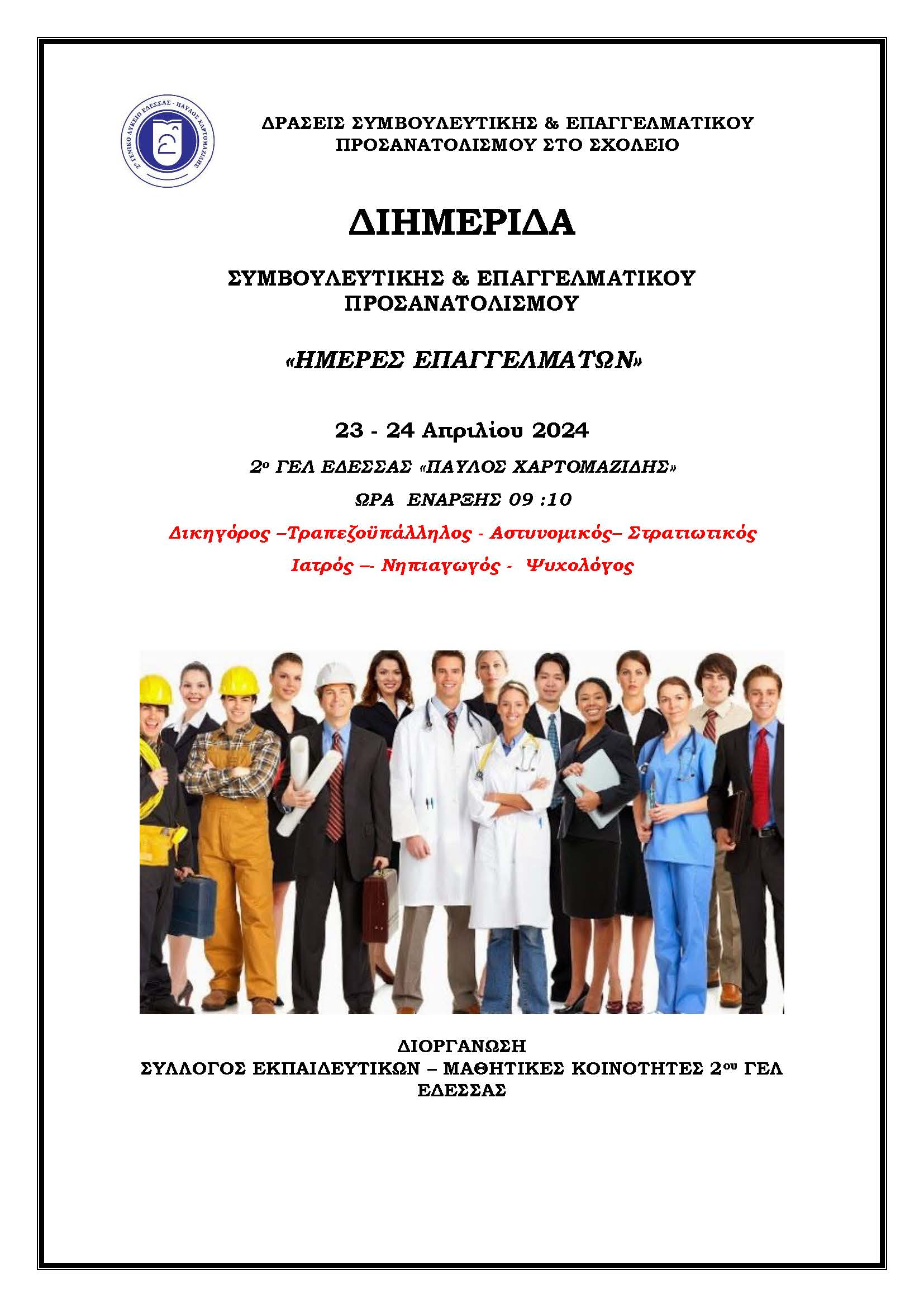 Με εξαιρετική επιτυχία πραγματοποιήθηκε στο 2ο ΓΕΛ Έδεσσας η Διημερίδα Συμβουλευτικής και Επαγγελματικού Προσανατολισμού με τίτλο «Ημέρες Επαγγελμάτων» στις 23 και 24 Απριλίου 2024.