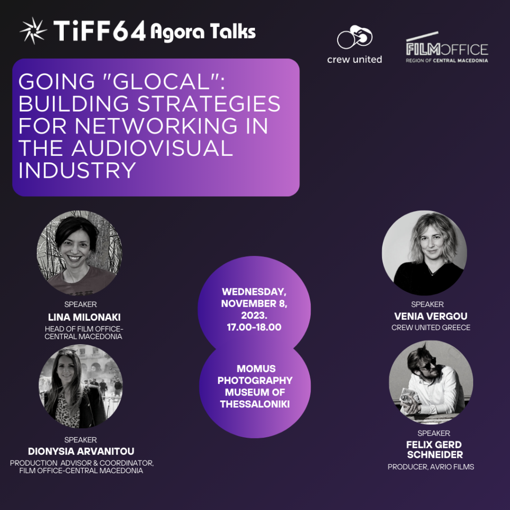 Εκπρόσωποι του Film Office της Περιφέρειας Κεντρικής Μακεδονίας και της online πλατφόρμας δικτύωσης Crew United, μαζί με τον Γερμανό παραγωγό Felix Gerd Schneider, συζητούν για το πώς οι επαγγελματίες του κινηματογράφου μπορούν να επωφεληθούν και να ενισχύσουν την καριέρα τους μέσω της δικτύωσης –τοπικά και διεθνώς. Τι σημαίνει πραγματικά να ανήκεις στην κινηματογραφική κοινότητα; Πώς εξασφαλίζει κανείς και διατηρεί αυτό το πλεονέκτημα; Η πρόσβαση, η τοποθέτηση και η εδραίωση ενός επαγγελματία στον οπτικοακουστικό κλάδο απαιτεί τόλμη για να εξασφαλίσει την ορατότητα και τη δικτύωση. Αυτό το πάνελ θα ασχοληθεί με τη σημασία των στρατηγικών δικτύωσης και της χρήσης καινοτόμων εργαλείων από επαγγελματίες που επιθυμούν να ξεπεράσουν τα όρια της τοπικής τους κοινότητας προκειμένου να δραστηριοποιηθούν σε διεθνές περιβάλλον.