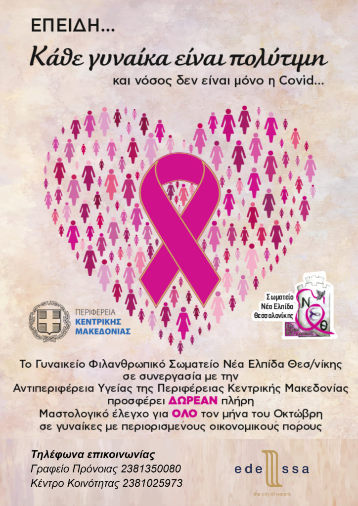 Την Τετάρτη, 17 Νοεμβρίου 2021, στο Χατζηγιάννειο, ο Δήμος Έδεσσας, σε συνεργασία με την Αντιπεριφέρεια Υγείας της Περιφέρειας Κεντρικής Μακεδονίας και το Γυναικείο Φιλανθρωπικό Σωματείο “Νέα Ελπίδα Θεσσαλονίκης”, θα πραγματοποιήσει δωρεάν μαστολογικό έλεγχο και μαστογραφία σε γυναίκες με περιορισμένους οικονομικούς πόρους – ανασφάλιστες, που έχουν ήδη δηλώσει ενδιαφέρον ανταποκρινόμενες σε προηγούμενο δελτίο τύπου.