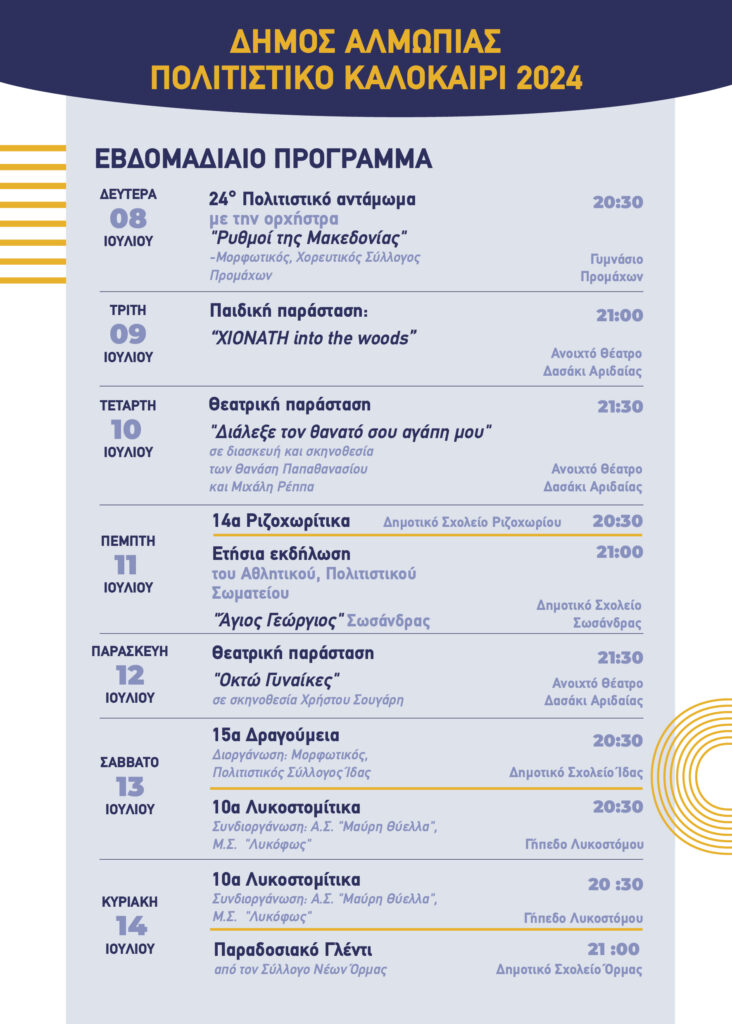 ΕΒΔΟΜΑΔΙΑΙΟ ΠΡΟΓΡΑΜΜΑ ΕΚΔΗΛΩΣΕΩΝ ΣΤΟΝ ΔΗΜΟ ΑΛΜΩΠΙΑΣ
