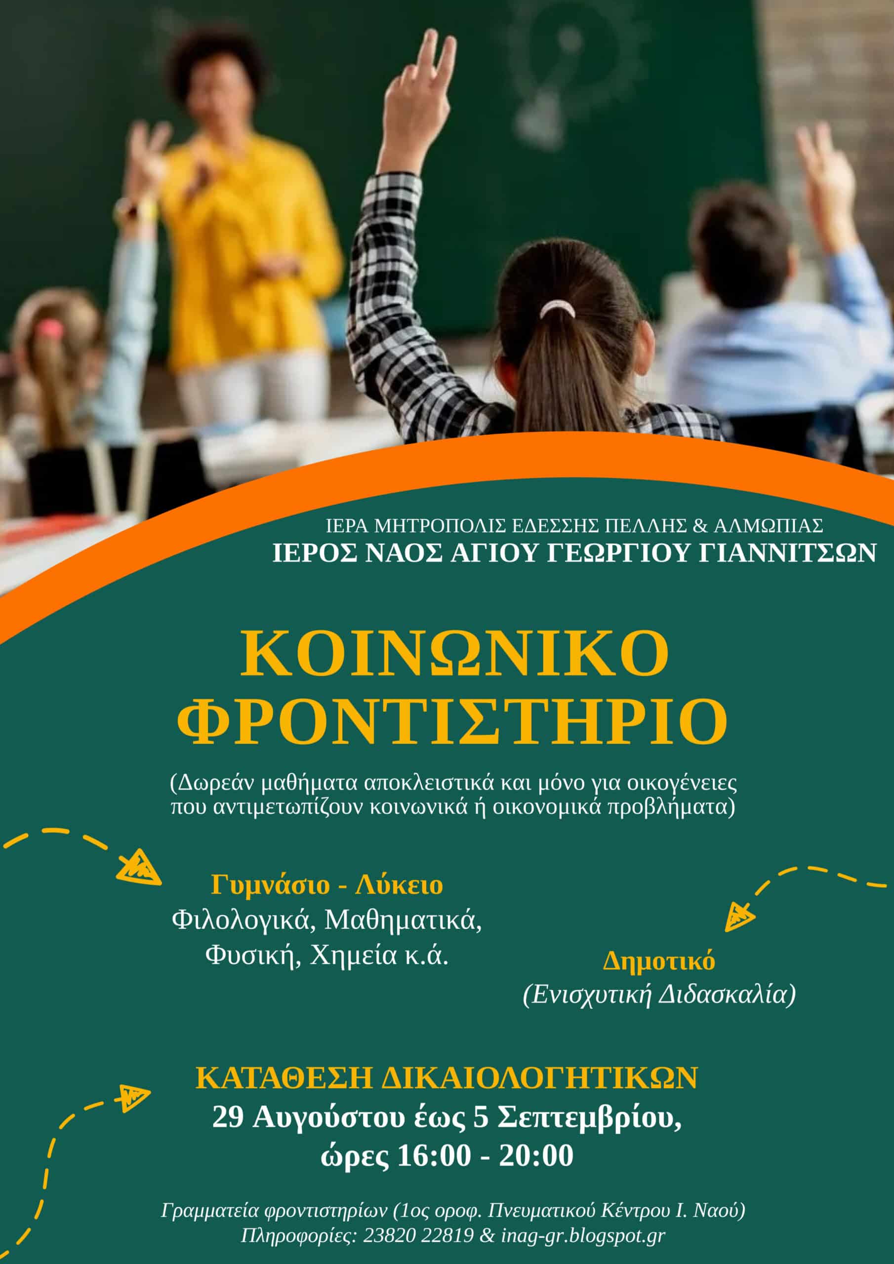 Για 17η συνεχόμενη χρονιά η ενορία Αγίου Γεωργίου Γιαννιτσών διοργανώνει, με την ευλογία της Ιεράς Μητροπόλεως Εδέσσης, Πέλλης και Αλμωπίας, δωρεάν φροντιστηριακά μαθήματα για το σχολικό έτος 2024-2025, τα οποία απευθύνονται σε παιδιά Δημοτικού, Γυμνασίου και Λυκείου και αφορούν αποκλειστικά οικογένειες που αντιμετωπίζουν κοινωνικά ή οικονομικά προβλήματα.