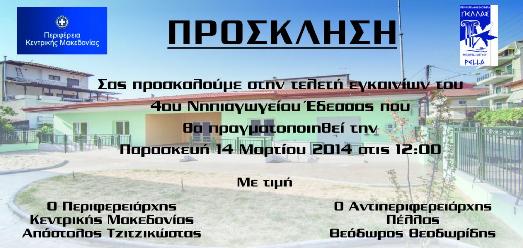 Την Παρασκευή, 14 Μαρτίου 2014 και ώρα 12.00 το μεσημέρι θα πραγματοποιηθούν τα εγκαίνια του 4ου Ολοήμερου Νηπιαγωγείου Έδεσσας από τον Περιφερειάρχη Κεντρικής Μακεδονίας Απόστολο Τζιτζικώστα και τον Αντιπεριφερειάρχη Πέλλας Θεόδωρο Θεοδωρίδη.