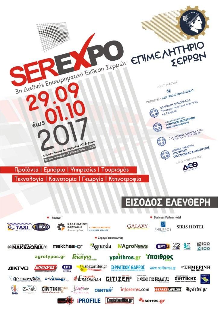 Για τρίτη συνεχή χρονιά η Περιφέρεια Κεντρικής Μακεδονίας στηρίζει την 3η Διεθνή Επιχειρηματική Έκθεση Σερρών (29 Σεπτεμβρίου έως Κυριακή 1 Οκτωβρίου 2017), με την επωνυμία Serexpo, που εγκαινιάζεται αύριο Παρασκευή 29 Σεπτεμβρίου 2017 στον αύλειο χώρο του Διοικητηρίου Σερρών. Την εκδήλωση διοργανώνει το Επιμελητήριο Σερρών, υπό την αιγίδα της Περιφέρειας Κεντρικής Μακεδονίας.