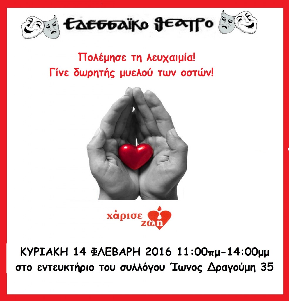 Το Εδεσσαϊκό Θέατρο συμβάλλοντας στην ευαισθητοποίηση του κόσμου για τη δωρεά μυελού των οστών, ζητά από τα μέλη και τους φίλους του συλλόγου να ανταποκριθούν στο κάλεσμα για εθελοντική δειγματοληψία. Την Κυριακή 14 Φλεβάρη 2016 από τις 11 το πρωί ως τις 2 το μεσημέρι , σας περιμένουμε στο εντευκτήριο του συλλόγου μας, όπου σε συνεργασία με τον σύλλογο Καρκινοπαθών Έδεσσας θα γίνει ενημέρωση σχετικά με τη διαδικασία.