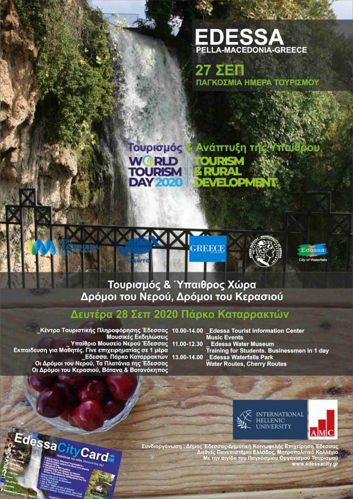 Ο Δήμος Έδεσσας και η Δημοτική Κοινωφελής Επιχείρηση Έδεσσας, σας προσκαλoύν στις εκδηλώσεις που θα λάβουν χώρα στις 28 Σεπτεμβρίου 2020 στο Πάρκο Καταρρακτών, προς εορτασμό της Παγκόσμιας Ημέρας Τουρισμού με θέμα «Τουρισμός και Ανάπτυξη της Υπαίθρου χώρας.