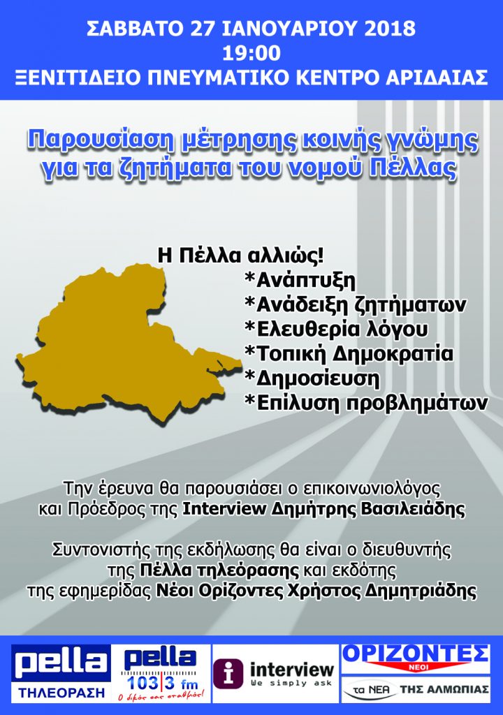 Το Σάββατο 27 Ιανουαρίου 2018 θα πραγματοποιηθεί στο Ξενιτίδειο Πνευματικό Κέντρο, στην Αριδαία, στις 19:00 παρουσίαση μέτρησης κοινής γνώμης για τα ζητήματα του νομού Πέλλας.