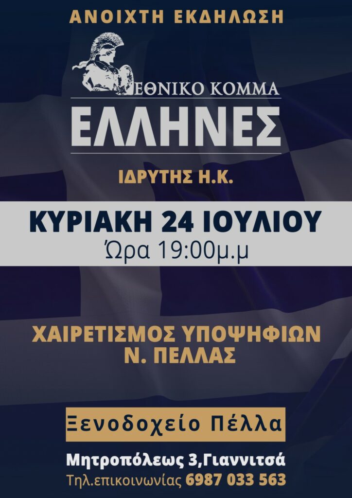 Εκδήλωση του εθνικού κόμματος ΕΛΛΗΝΕΣ θα πραγματοποιηθεί την Κυριακή 24 Ιουλίου στο ξενοδοχείο Πέλλα στις 19:00.