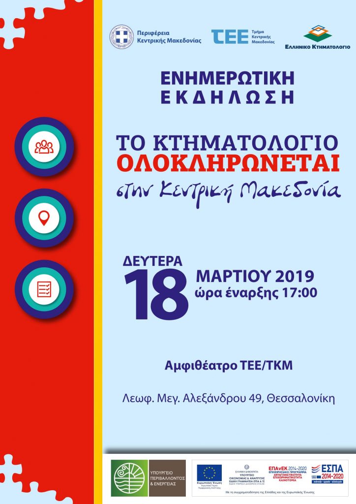 Το Ελληνικό Κτηματολόγιο και η Περιφέρεια Κεντρικής Μακεδονίας διοργανώνουν ενημερωτική εκδήλωση με θέμα «Το Κτηματολόγιο ολοκληρώνεται στην Κεντρική Μακεδονία» σε συνεργασία με το Τεχνικό Επιμελητήριο Ελλάδας/Τμήμα Κεντρικής Μακεδονίας.