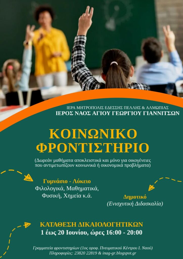 Για 17η συνεχόμενη χρονιά η ενορία Αγίου Γεωργίου Γιαννιτσών διοργανώνει, με την ευλογία της Ιεράς Μητροπόλεως Εδέσσης, Πέλλης και Αλμωπίας, δωρεάν φροντιστηριακά μαθήματα για το σχολικό έτος 2024-2025, τα οποία απευθύνονται σε παιδιά Δημοτικού, Γυμνασίου και Λυκείου και αφορούν αποκλειστικά οικογένειες που αντιμετωπίζουν κοινωνικά ή οικονομικά προβλήματα.