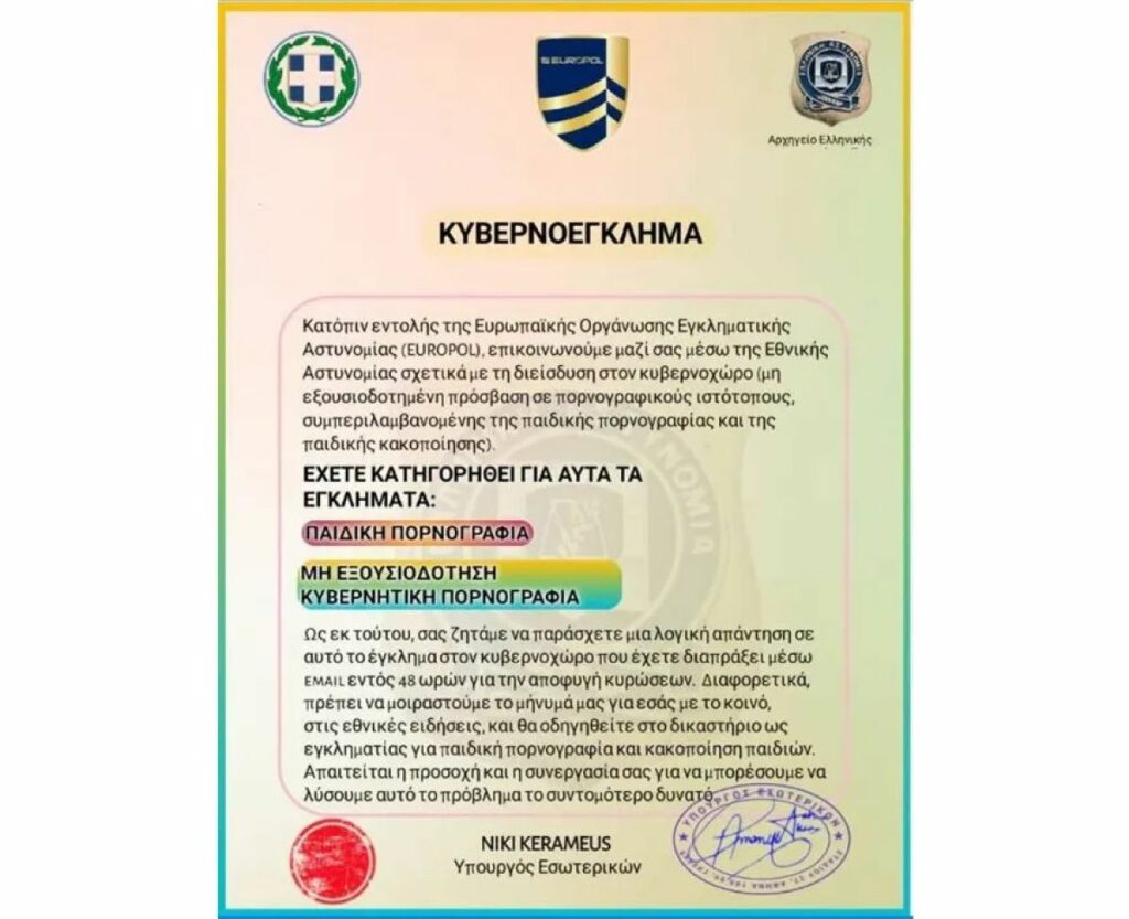 Μάλιστα, στην προσπάθειά τους να προσδώσουν «αληθοφάνεια» στη σχετική επιστολή χρησιμοποιούν τα λογότυπα της Ελληνικής Δημοκρατίας, της Ελληνικής Αστυνομίας και της Europol, καθώς και εντύπωμα σφραγίδας με δήθεν υπογραφή της Υπουργού Εσωτερικών.
