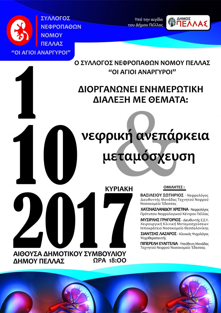 Ενημερωτική διάλεξη Συλλόγου Νεφροπαθών “Οι Άγιοι Ανάργυροι” με θέμα: νεφρική ανεπάρκεια-μεταμόσχευση,αiτίες και αντιμετώπιση στην αίθουσα δημοτικού συμβουλίου Πέλλας στα Γιαννιτσά