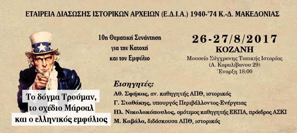 «Το δόγμα Τρούμαν, το σχέδιο Μάρσαλ και ο ελληνικός εμφύλιος» είναι το θέμα της 10ης ετήσιας συνάντησης που διοργανώνει η Εταιρεία Διάσωσης Ιστορικών Αρχείων (ΕΔΙΑ) 1940-1974 Κ.-Δ. Μακεδονίας για την Κατοχή και τον Εμφύλιο, που θα πραγματοποιηθεί το Σάββατο 26 Αυγούστου στην Κοζάνη, στο Μουσείο Σύγχρονης Τοπικής Ιστορίας (Α. Καραλίβανου 29), ενώ το πρωί της Κυριακής 27 Αυγούστου θα πραγματοποιηθεί ιστορική ξενάγηση στη Σιάτιστα.