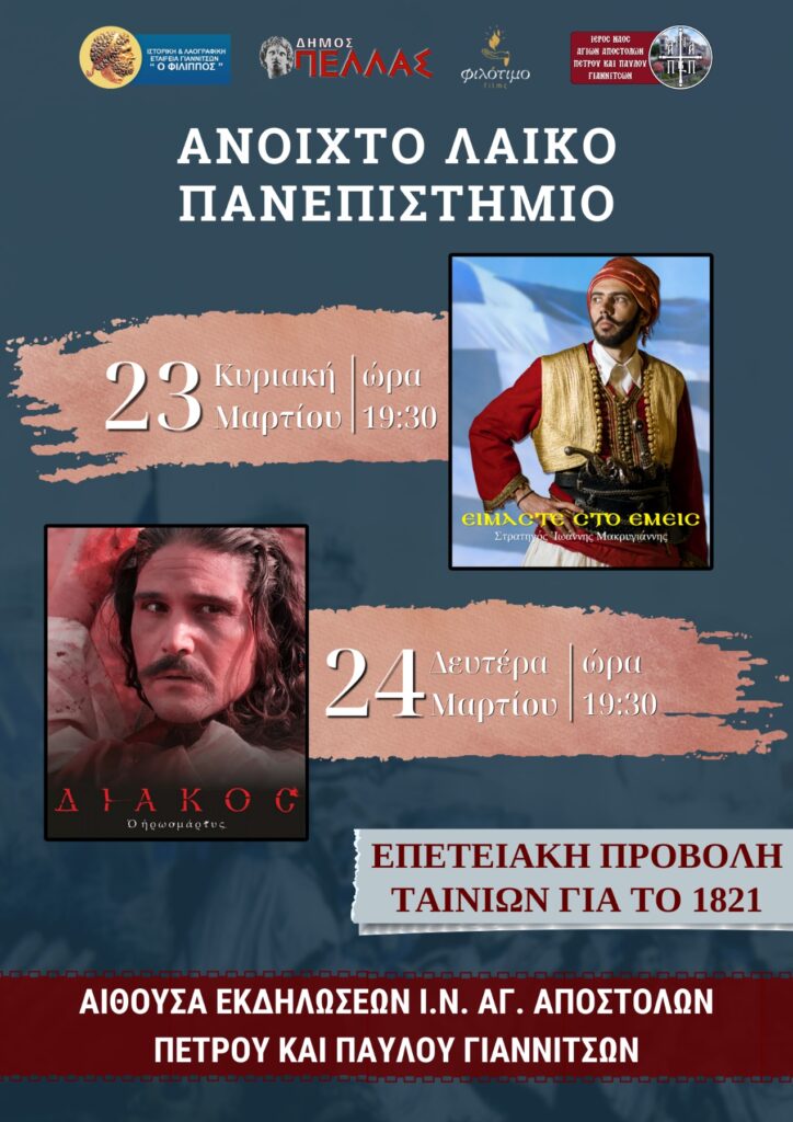 Στο πλαίσιο του Ανοιχτού Λαϊκού Πανεπιστημίου Γιαννιτσών η Ιστορική και Λαογραφική Εταιρεία Γιαννιτσών «Ο ΦΙΛΙΠΠΟΣ» σε συνεργασία με τον Δήμο Πέλλας, τον Ιερό Ναό Αγίων Αποστόλων Πέτρου και Παύλου Γιαννιτσών και την ΦΙΛΟΤΙΜΟ Films παρουσιάζουν επετειακή προβολή ταινιών για το 1821.