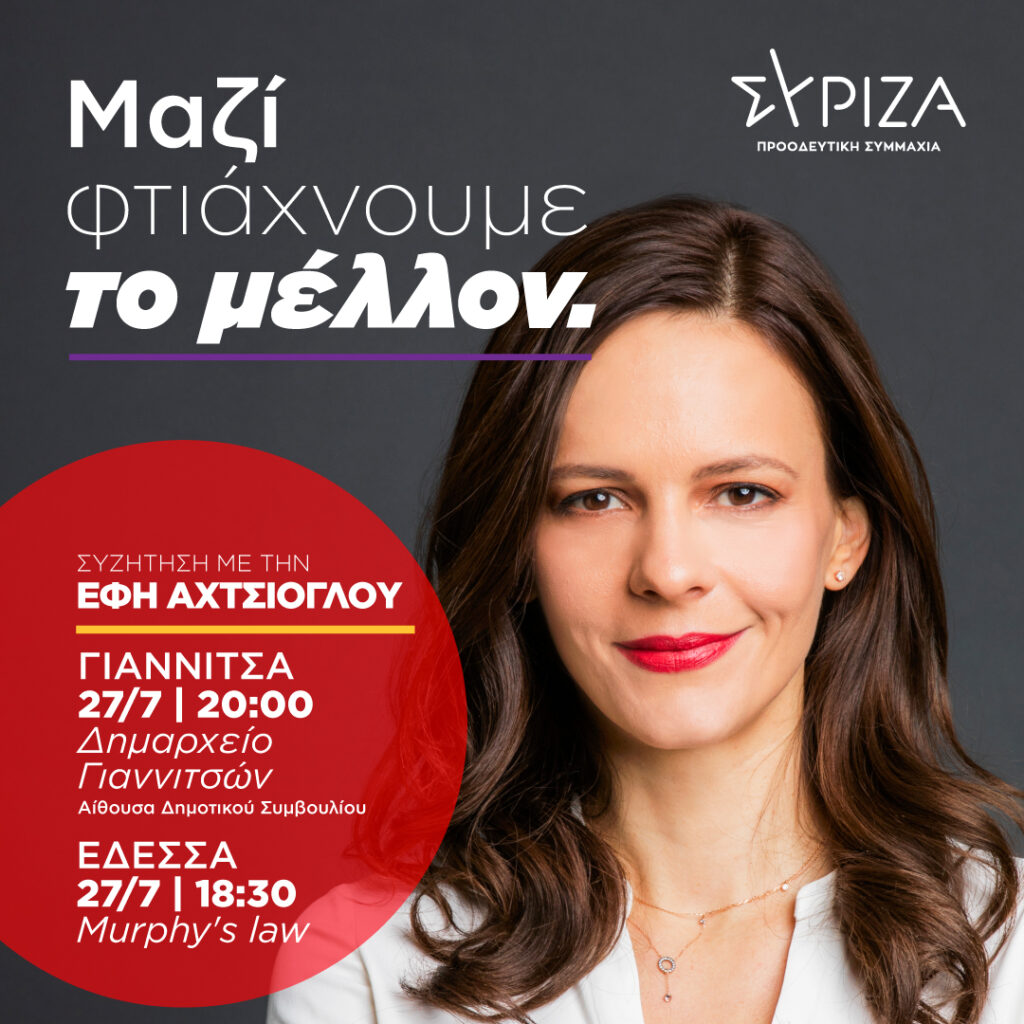 Στο πλαίσιο της περιοδείας της, η Έφη Αχτσιόγλου την Πέμπτη 27/7 θα βρίσκεται στην Έδεσσα, όπου θα συμμετάσχει σε ανοιχτή συζήτηση στο Murphy’s Law, στις 18:30.