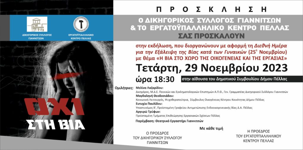 Ως Εργατικό Κέντρο Πέλλας κάνουμε δική μας υπόθεση τον αγώνα κατά των σεξιστικών διακρίσεων και της έμφυλης βίας στους χώρους δουλειάς. Καλούμε τους συναδέλφους και τις συναδέλφισσες μας να μην κλείνουν τα μάτια στα περιστατικά που συμβαίνουν δίπλα τους. Για τον σκοπό αυτό διοργανώνουμε ανοιχτή εκδήλωση μαζί με τον Δικηγορικό σύλλογο Γιαννιτσών με θέμα «Η βία στον χώρο της οικογένειας και της εργασίας» την Τετάρτη 29 Νοέμβριου και ώρα 18.30μμ στην αίθουσα του Δημοτικού Συμβουλίου