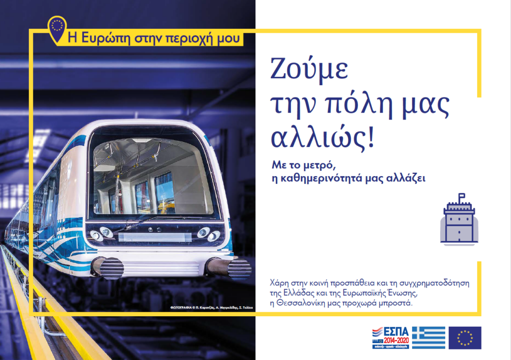 Το Μετρό, που συγχρηματοδοτήθηκε από την ΕΕ με πόρους ύψους €1δισ., υπόσχεται μια νέα βελτιωμένη καθημερινότητα για τη Θεσσαλονίκη, με απρόσκοπτη κινητικότητα των πολιτών, μείωση των αποστάσεων, αποσυμφόρηση της κίνησης των οχημάτων στους δρόμους και βελτίωση του αστικού περιβάλλοντος.