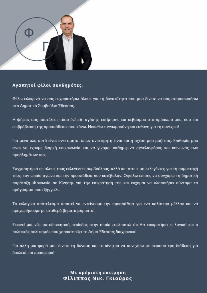 Ευχαριστήριο μήνυμα από τον Δημοτικό Σύμβουλο Φίλιππο Γκιούρο