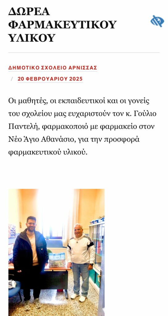👉🏼Το Φαρμακείο Γούλιος Κ. Παντελής αισθάνεται ιδιαίτερη χαρά που είχε την ευκαιρία να στηρίξει το Δημοτικό Σχολείο Άρνισσας μέσα από τη χορηγία φαρμακευτικού υλικού. Η υγεία και η φροντίδα των παιδιών μας είναι προτεραιότητα όλων μας, και είναι τιμή μας να συμβάλλουμε στην καθημερινότητά τους με όποιον τρόπο μπορούμε.
