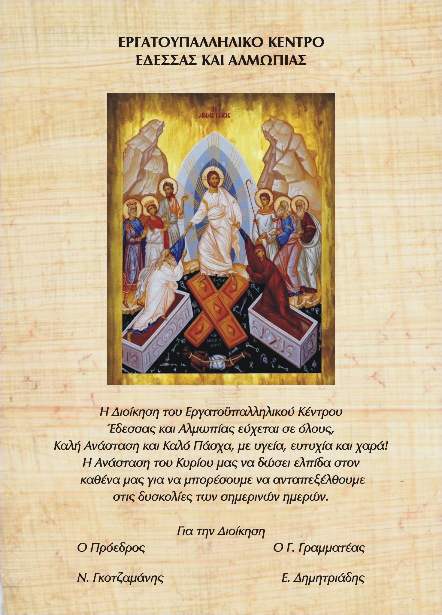 ΕΥΧΕΣ ΠΑΣΧΑ ΕΡΓΑΤΟΫΠΑΛΛΗΛΙΚΟΥ ΚΕΝΤΡΟΥ ΕΔΕΣΣΑΣ ΚΑΙ ΑΛΜΩΠΙΑΣ