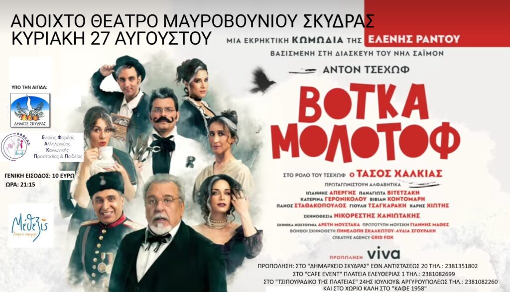 Μια απολαυστική καλοκαιρινή βραδιά υπόσχονται να μας προσφέρουν οι συντελεστές της θεατρικής παράστασης «Βότκα Μολότοφ» που ανεβαίνει στη σκηνή του Δημοτικού Θεάτρου Μαυροβουνίου Σκύδρας, την Κυριακή 27 Αυγούστου 2023 κι ώρα 21:15΄.
