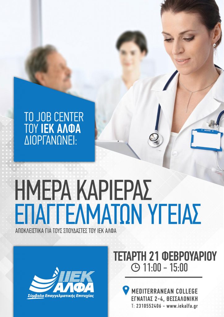 Το Job Center του ΙΕΚ ΑΛΦΑ Θεσσαλονίκης διοργανώνει Ημέρα Καριέρας αποκλειστικά αφιερωμένη στα επαγγέλματα Υγείας, την Τετάρτη 21 Φεβρουαρίου 2018 και ώρα 11.00 π.μ, στις εγκαταστάσεις του Mediterranean College, Εγνατίας 2-4.