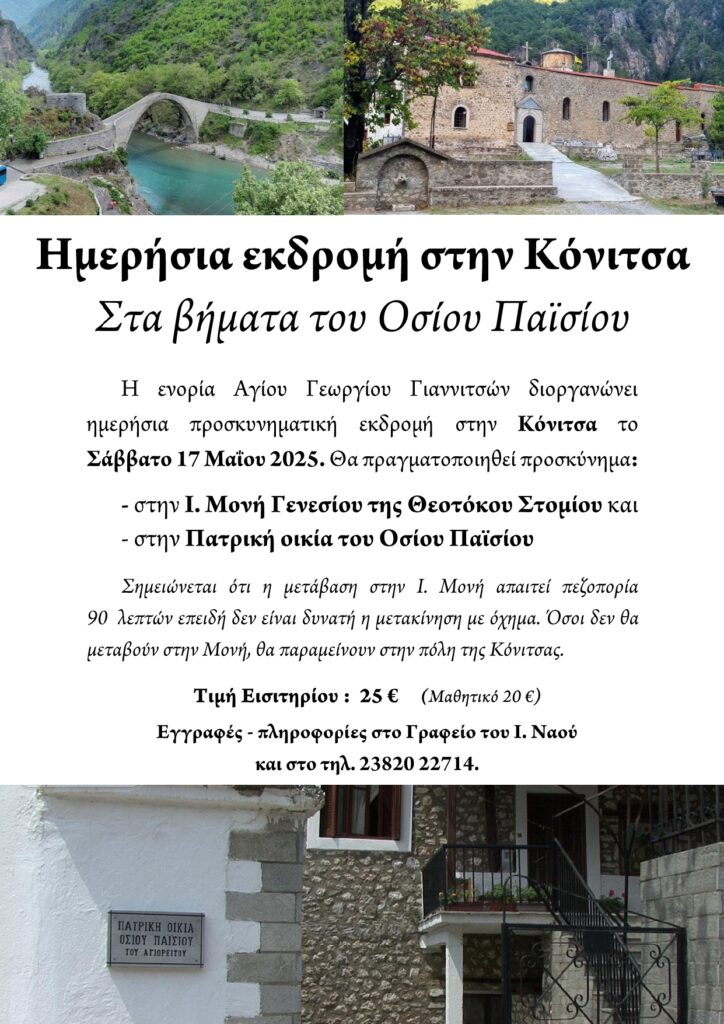 Η ενορία Αγίου Γεωργίου Γιαννιτσών διοργανώνει ημερήσι α προσκυνηματική εκδρομή στην Κόνιτσα το Σάββατο 17 Μαΐου 2025. Θα πραγματοποιηθεί προσκύνημα: