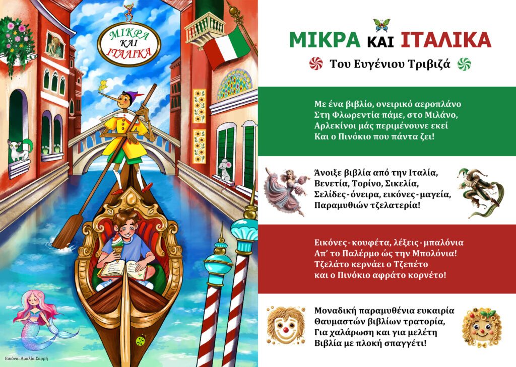 Ανάμεσά τους, ένα λίαν γευστικό ποίημα του Ευγένιου Τριβιζά, με ονειρική εικονογράφηση της Αμαλίας Σαρρή: ο Πινόκιο ως γονδολιέρης σε ένα βενετσιάνικο κανάλι με γοργόνες και αρλεκίνους!