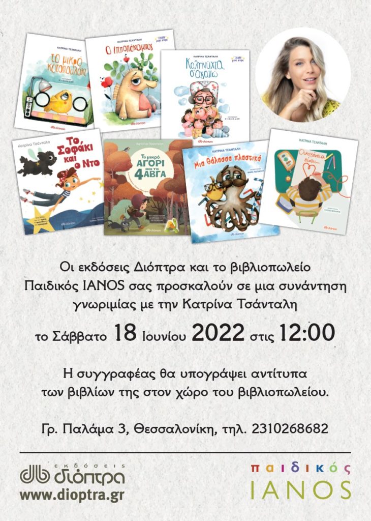 Το Σάββατο 18 Ιουνίου, στις 12:00 η συγγραφέας Κατρίνα Τσάνταλη έρχεται στον Παιδικό ΙΑΝΟ της Θεσσαλονίκης, Γρ. Παλαμά 3, για μια συνάντηση γνωριμίας, υπογράφει τα βιβλία της που κυκλοφορούν από τις Εκδόσεις Διόπτρα και συνομιλεί με τους αναγνώστες της.