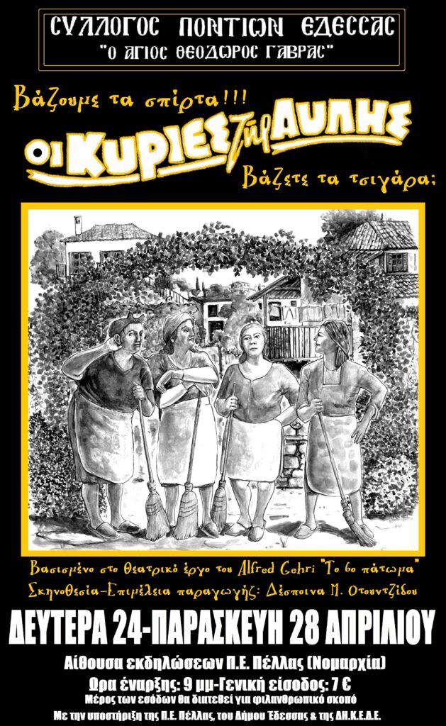 Την σκηνοθεσία και την επιμέλεια της παραγωγής υπογράφει η Δέσποινα Οτουντζίδου που παρέα με ένα 30μελή θίασο υπόσχονται να κατακτήσουν το Θεατρόφιλο κοινό της πόλης. Παραστάσεις θα δοθούν στην αίθουσα εκδηλώσεων της Π.Ε. Πέλλας (Νομαρχία) από την Δευτέρα 24 ως και την Παρασκευή 28 Απριλίου 2023 με ώρα έναρξης 9 μμ και γενική είσοδο 7€. Αξίζει να σημειωθεί πως σύμφωνα με ομόφωνη απόφαση του Διοικητικού Συμβουλίου, μέρος των εσόδων θα διατεθεί για φιλανθρωπικό σκοπό.